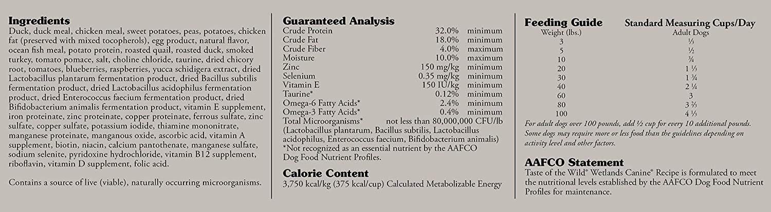 The Taste of the Wild Wetlands Canine Formula is a premium grain-free dry dog food designed to meet the nutritional needs of dogs of all breeds and life stages. Featuring duck and turkey as the primary protein sources, this formula provides high-quality, easily digestible protein to support lean muscle development and overall vitality.