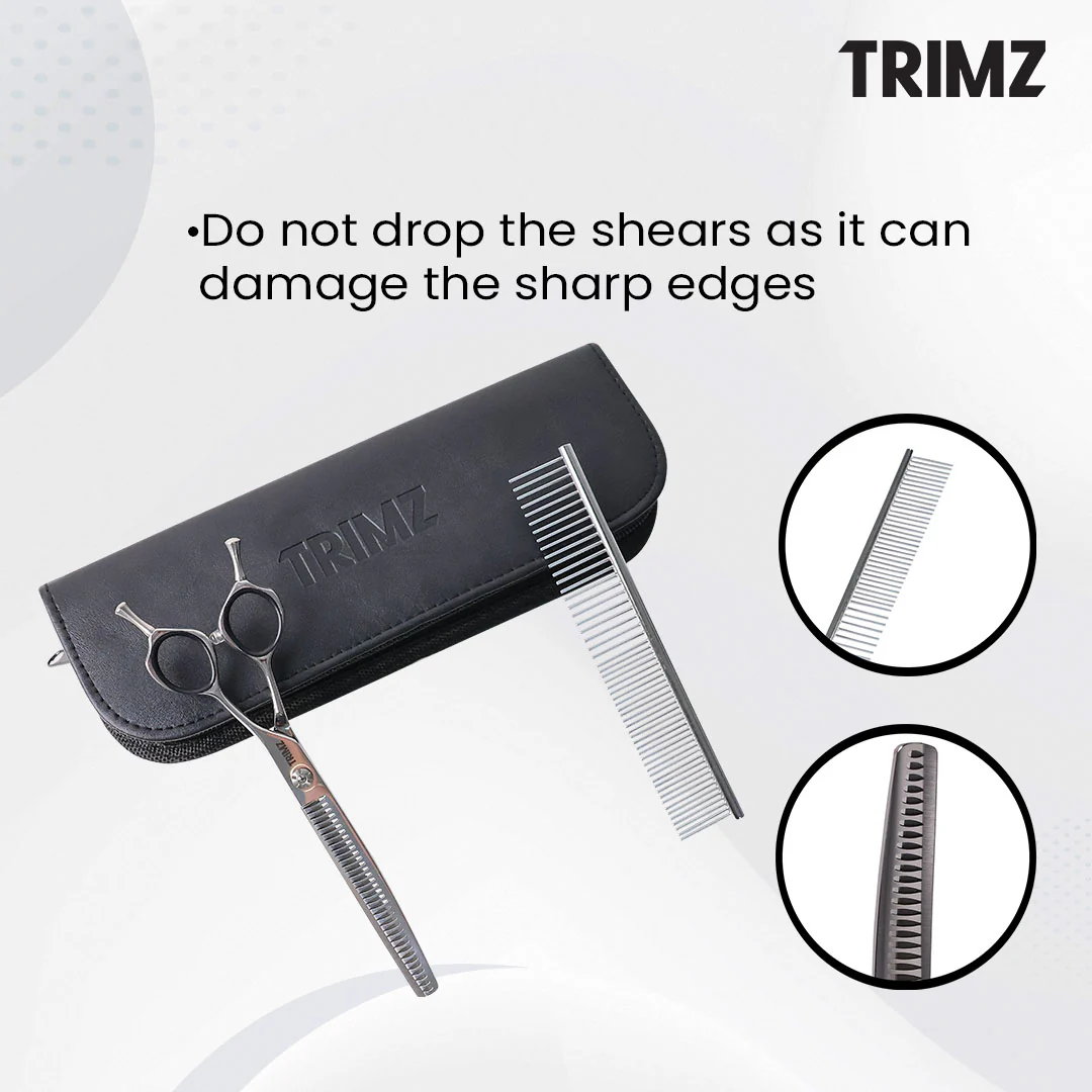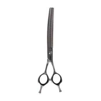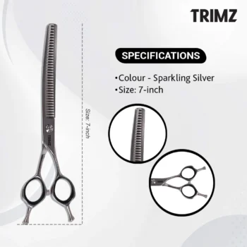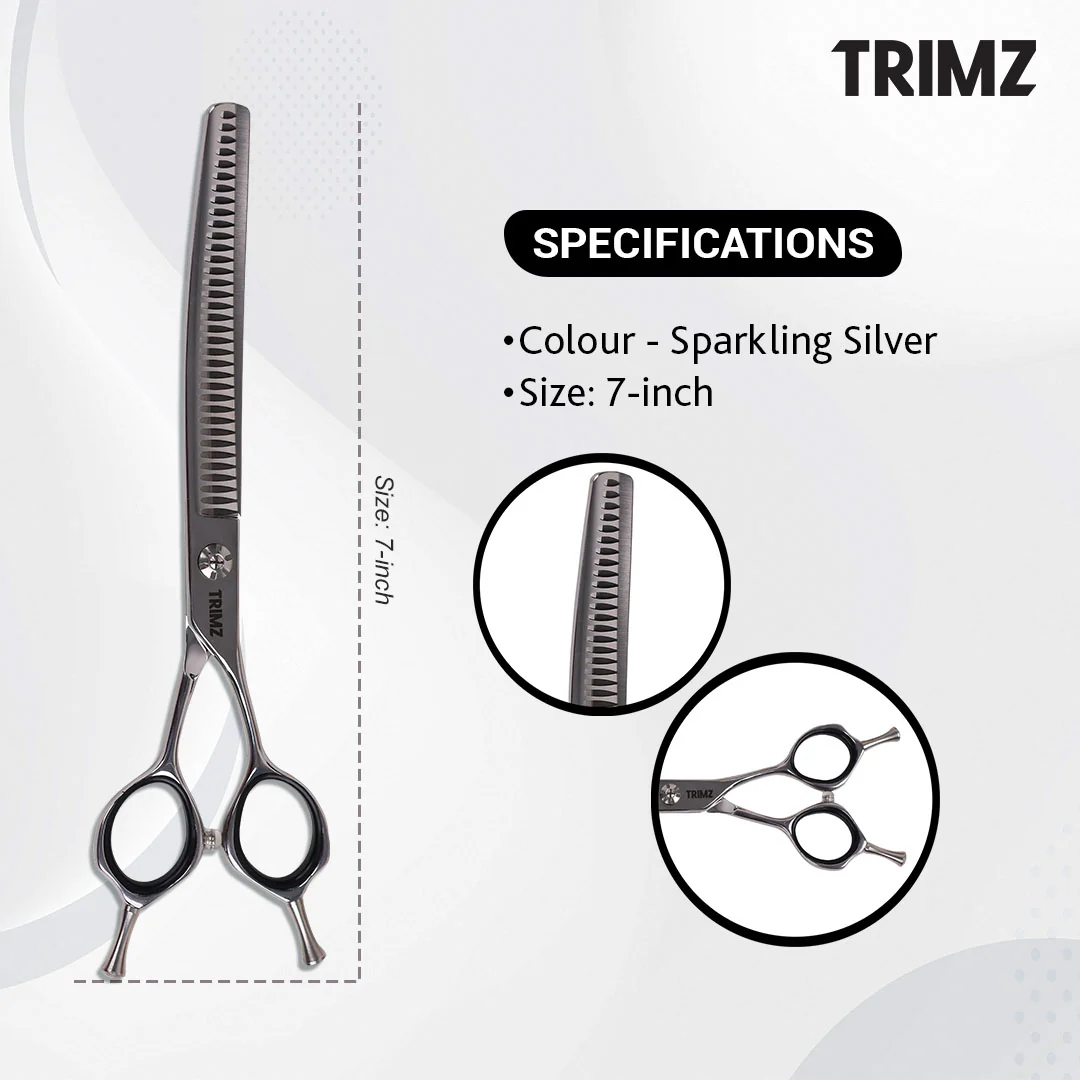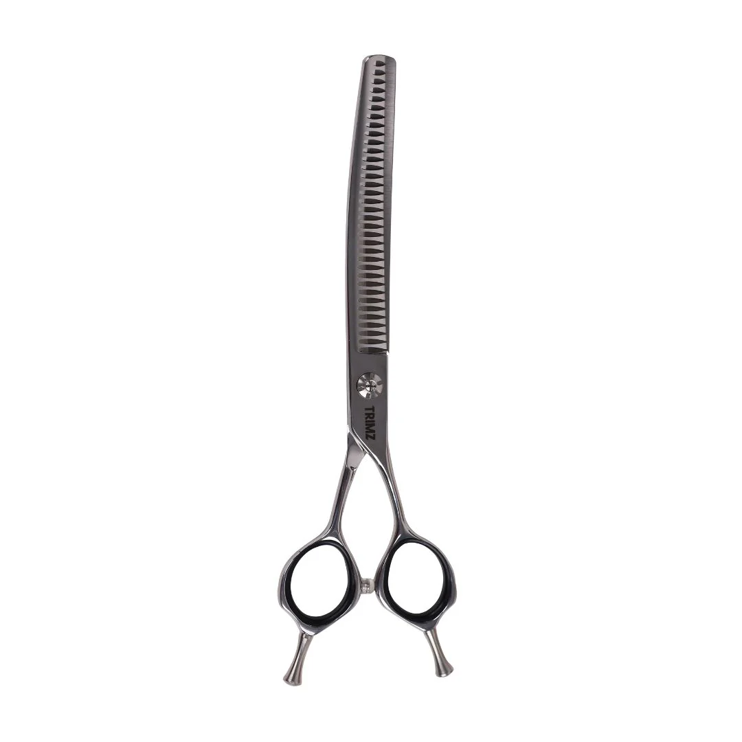 Trimz Curved Chunker Scissors, 7", are made of stainless steel and high-quality color-coated, ensuring edge durability. Premium-looking Trimz Curved Chunker scissors are designed with comfortable grip shanks for proper hand alignment. They are excellent professional-grade shears that can be used for both daily professional grooming and at-home grooming and have fancy tension. These Trimz Curved Chunker scissors are the most economical choice and perfect for a versatile and professional-grade finish. Trimz Curved Chunker scissors come with a stylish scissor holder case, a 7" steel comb, and a cleaning cloth.