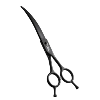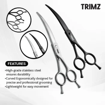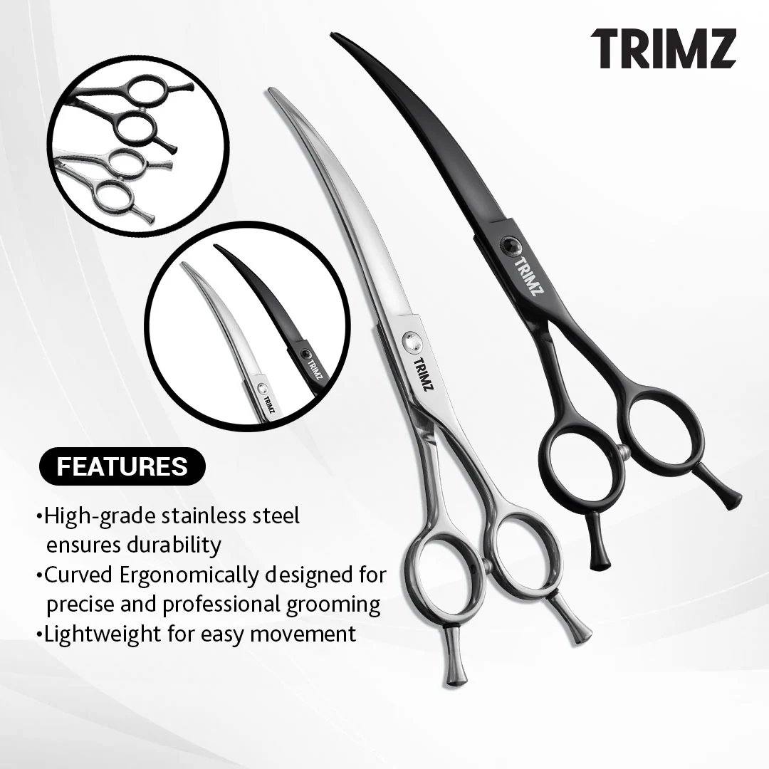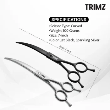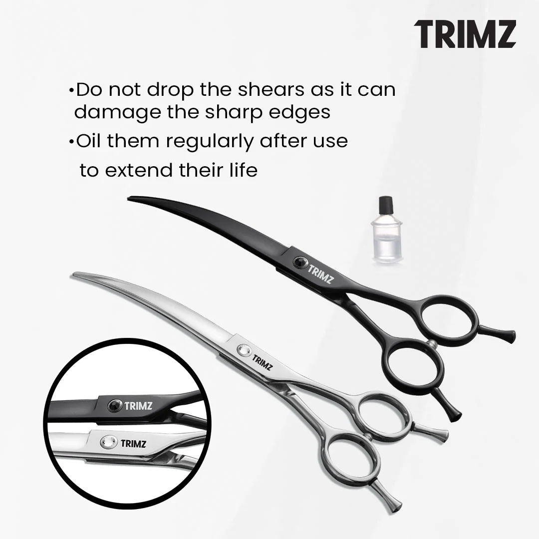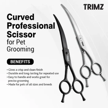 Trimz Curved Scissors come with premium-looking, comfortable grip shanks for proper hand alignment and high-grade stainless steel for durability. Curved scissors with high-grade material and color-coated stainless steel ensure durability and long edge life for professional pet grooming. They are excellent, professional-grade shears with a tension knob that can be used for both professional and home grooming. Lightweight Trimz Curved Scissors are for easy movement and handling while pet grooming. Trimz Curved Scissors are the most economical choice and perfect for a versatile and professional-grade finish. The scissors come with a stylish scissor case holder, a cleaning cloth, a scissor screw adjuster, and scissor oil for maintenance. Trimz Curved Scissors are available in two colors: sparkling silver and jet black.