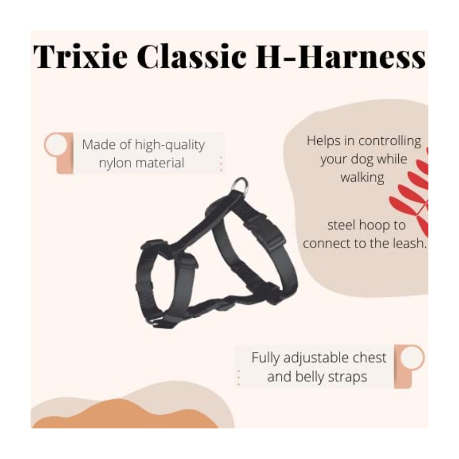 Trixie premium harness for dogs has an 'H' design which means that the shape of the harness makes putting on and taking off the harness very easy, your pet can just step into it and the snap buckle ensures a secure fit. The harness is made from durable high-quality nylon and is fully adjustable so you can ensure comfort for your pet. Great as an alternative to a collar and lead when walking your pet, reducing the strain put on your pet's neck when or if they pull, distributing this force around their torso instead.