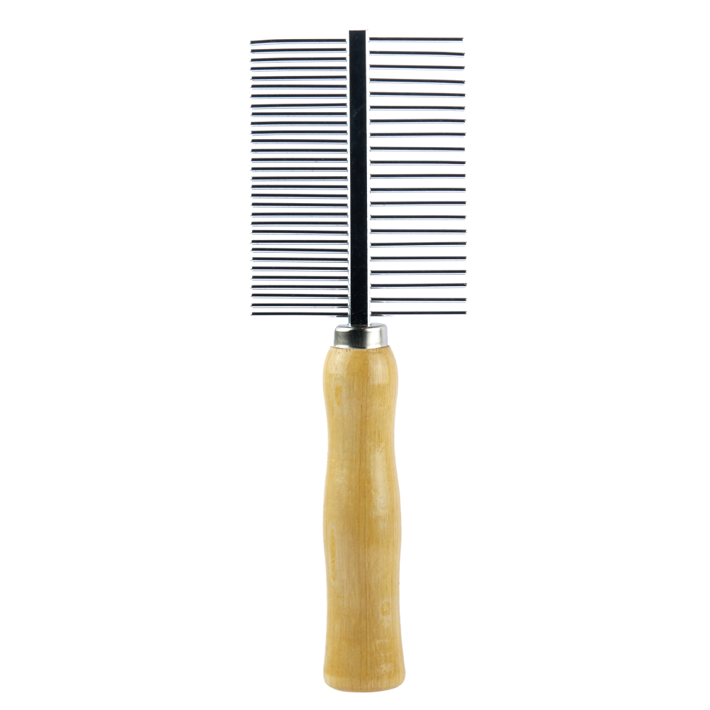 The Trixie double-sided comb features a wooden handle. The dual comb has a Coarse Comb on one side to loosen dense matted fur and a fine comb on the other side to comb through hair to give a shiny silky tangle-free finished coat. The comb head is made of stainless steel and built to last a lifetime.
