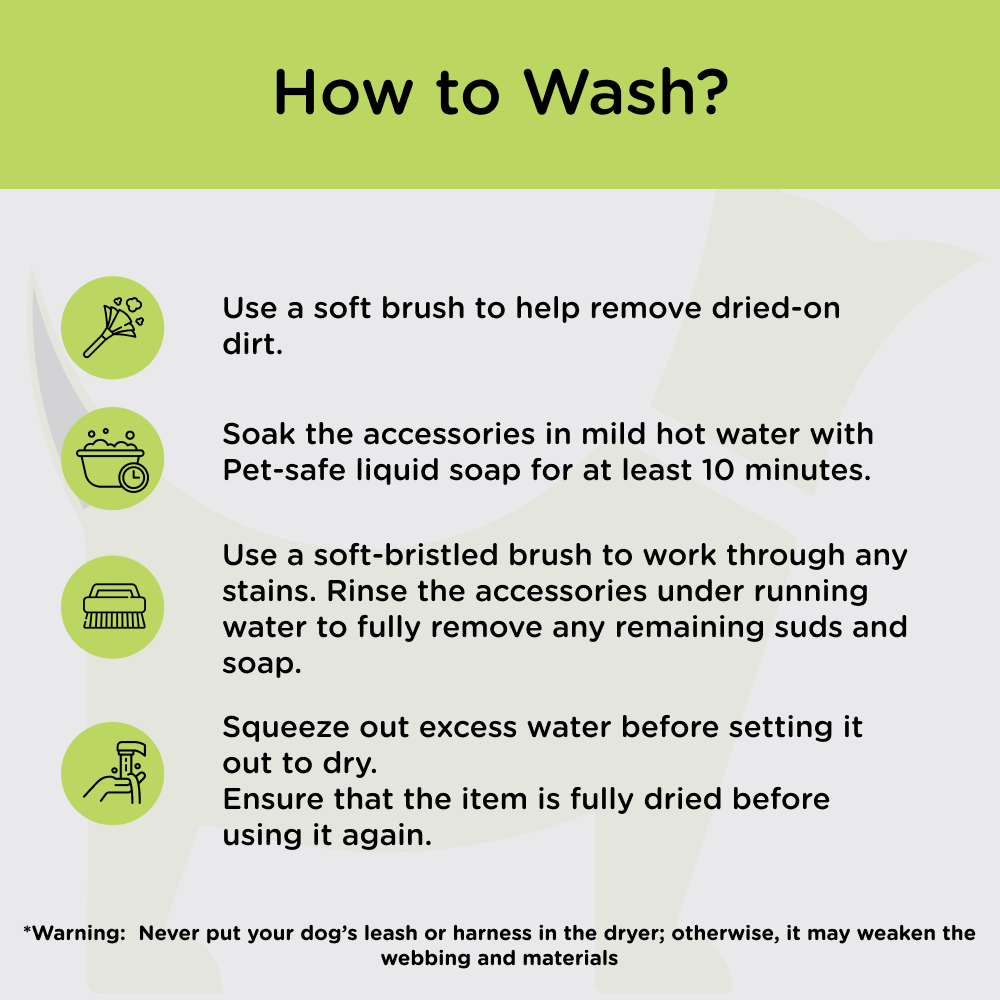3. Handwash the product with mild soap, and not machine wash to maximize the lifespan of the product. If the product gets wet or is washed, please allow it to air dry completely before having your furry friend wear it.
