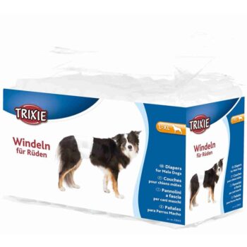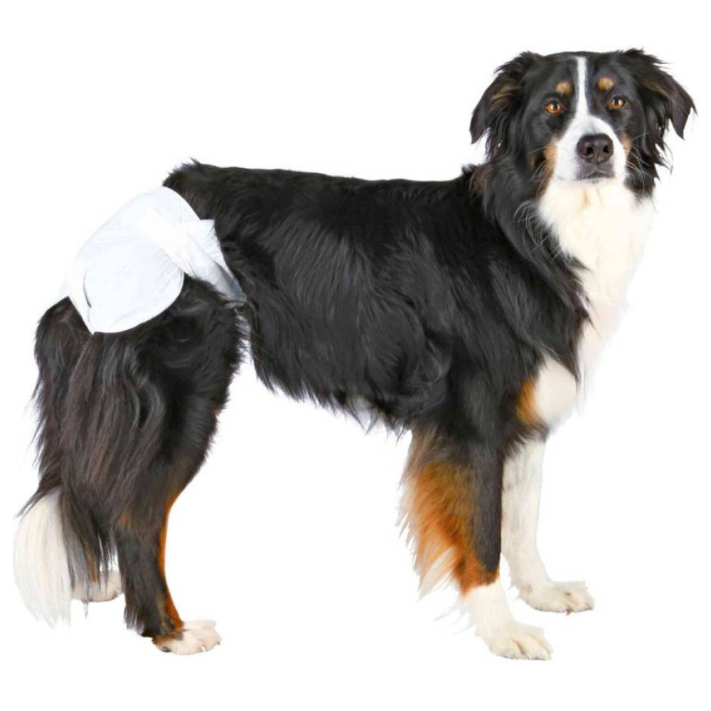 Diapers for Female Dogs, hygiene for incontinence, females in season, after operations and when travelling, good fit due to elastic band at waist and legs, highly absorbent, with opening for tail, with wide adhesive fasteners on both sides, disposable. Diapers are very useful if you have a bitch that is in heat and living indoors or a dog that is incontinent. They will catch any leaking, or discharge that may be an issue for your dog. If your dog is living indoors this can be a problem in terms of hygiene for people or children in the house as well as a problem for your furniture. Using the diapers is an easy way to combat these issues.