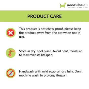 3. Handwash the product with mild soap, and not machine wash to maximize the lifespan of the product. If the product gets wet or is washed, please allow it to air dry completely before having your furry friend wear it.