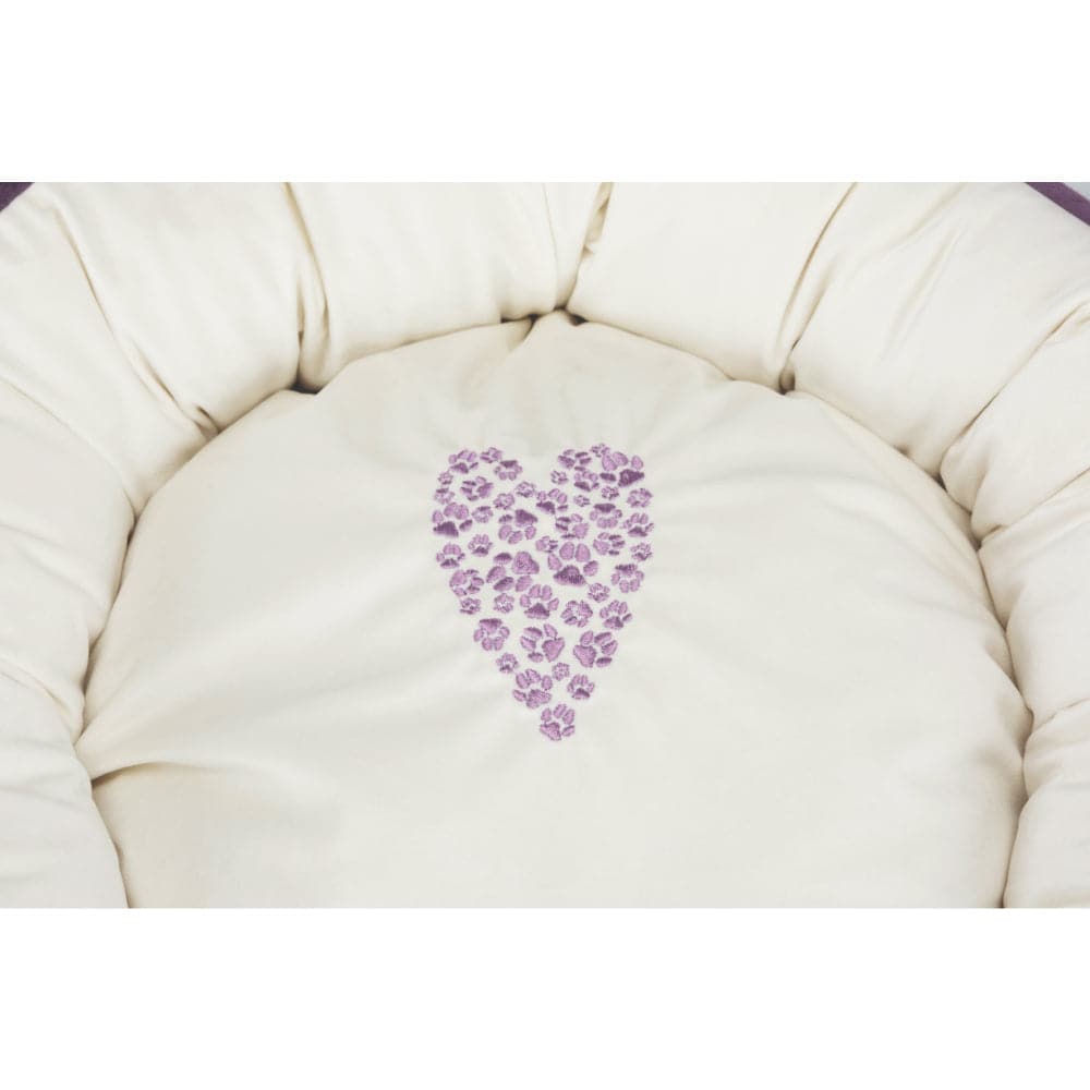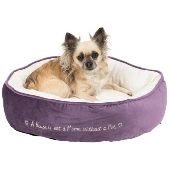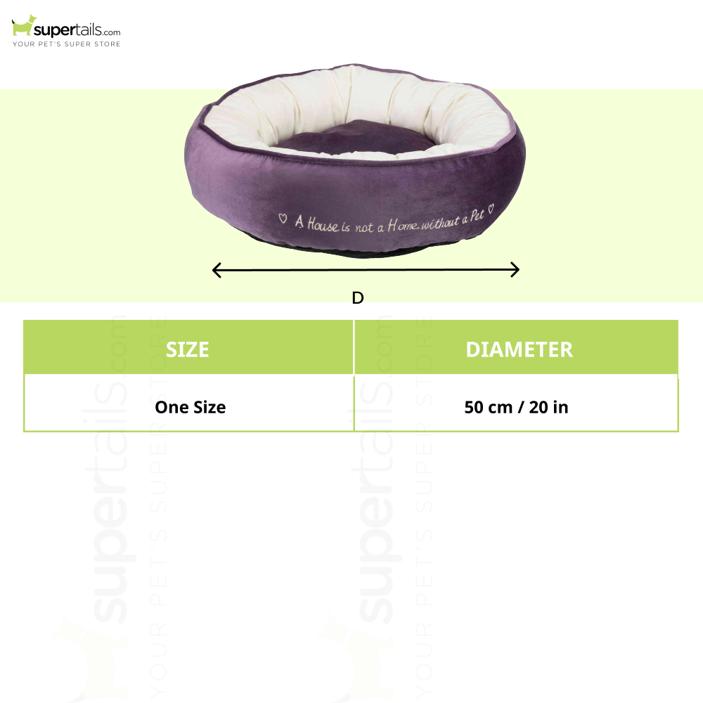 Pet's Home Round Bed has a velvet look and it has polyester cover. Polyester fleece filling. Comes with reversible cushion and removable covers. Non-slip bottom. Inlet is hand washable and cover is machine washable.