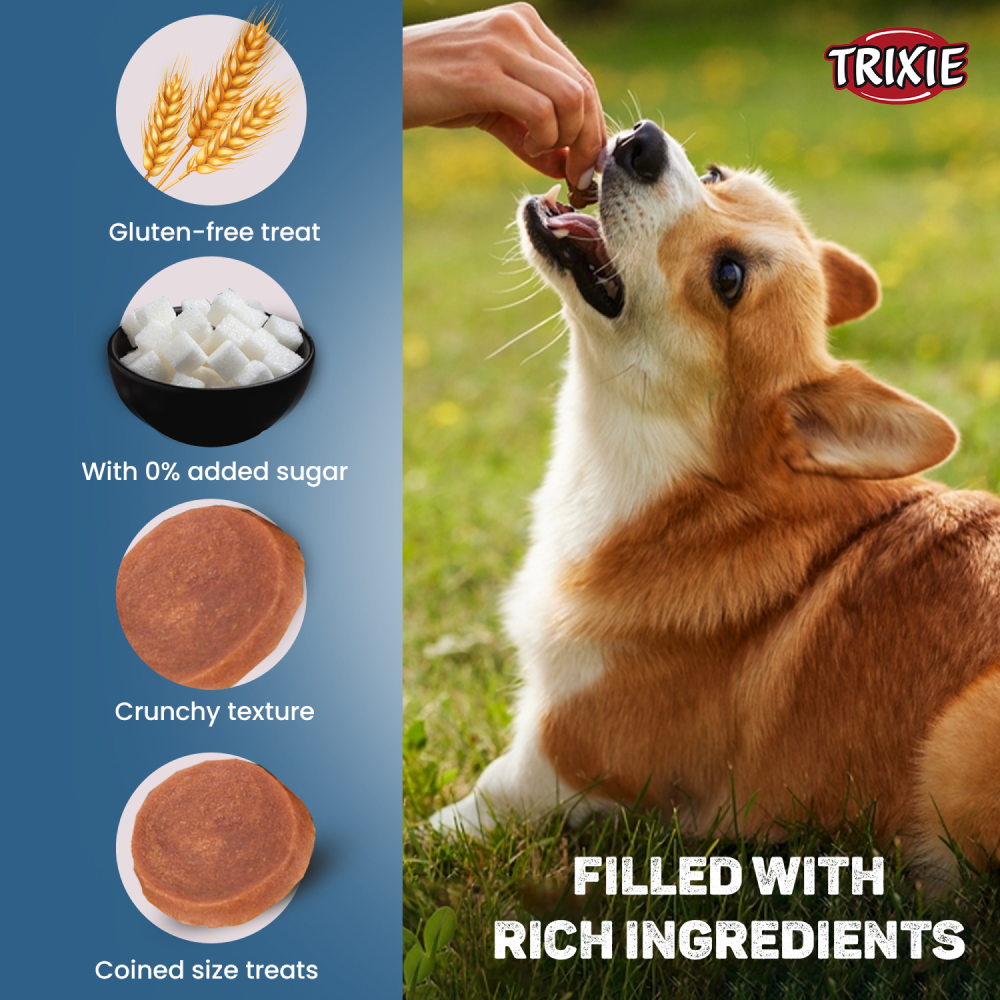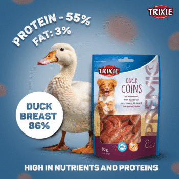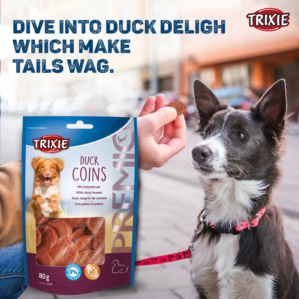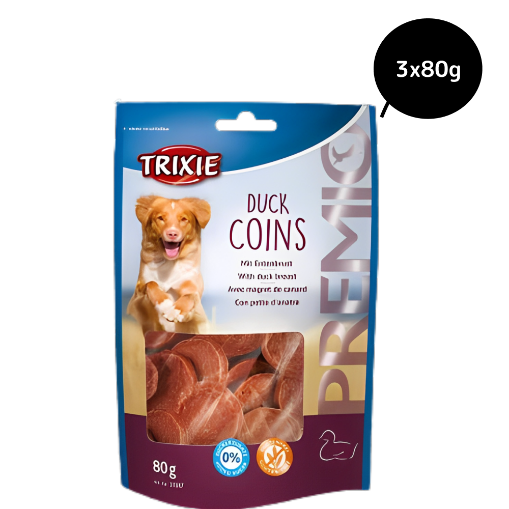 Introducing Trixie Premio Dog Treats, featuring the delectable Duck Coins flavour. Suitable for all breeds of dogs, these treats come in an 80g pack, providing a healthy snacking option rich in essential nutrients.