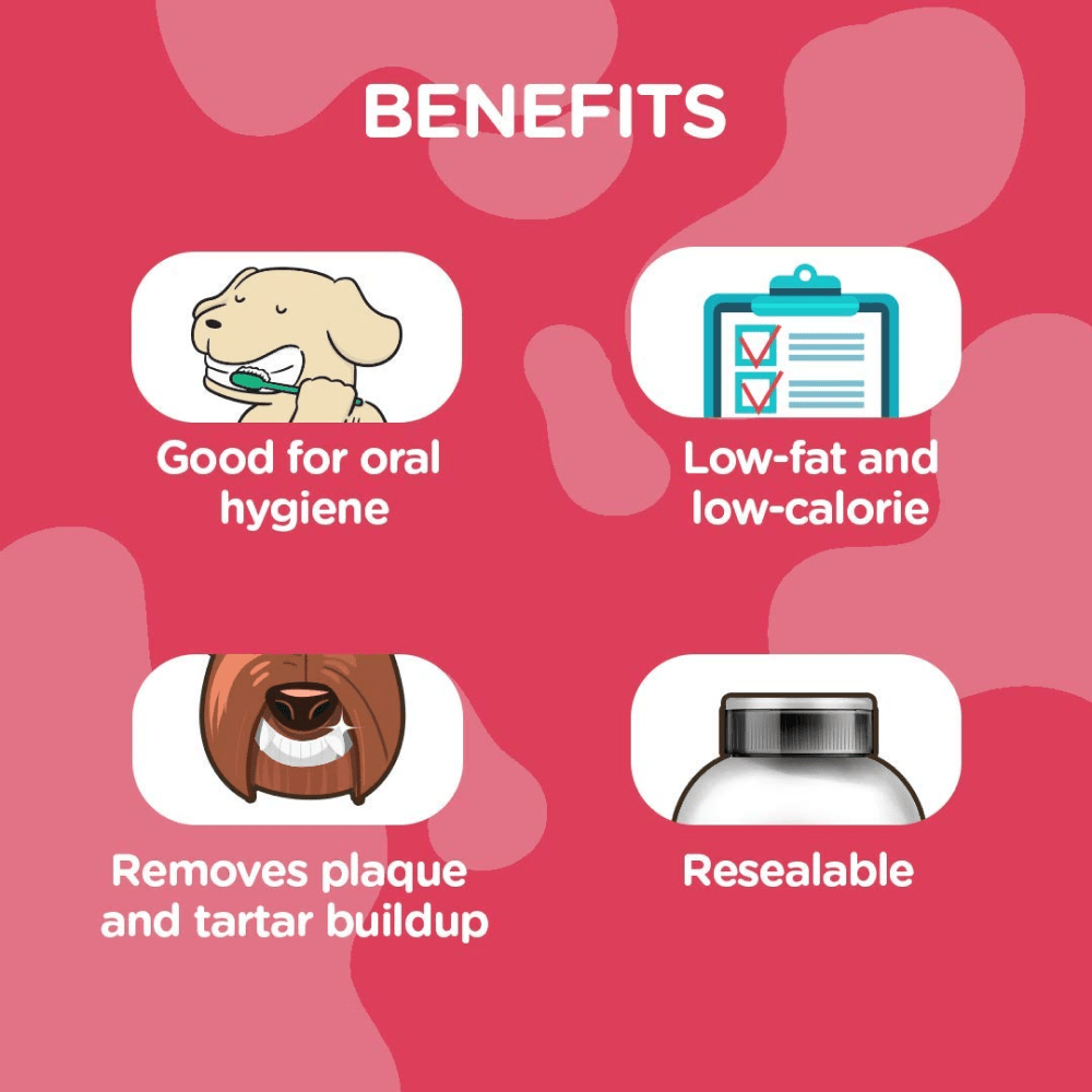 - Our low-fat oral care dog treat removes plaque and tartar build-up through chewing and freshens breath